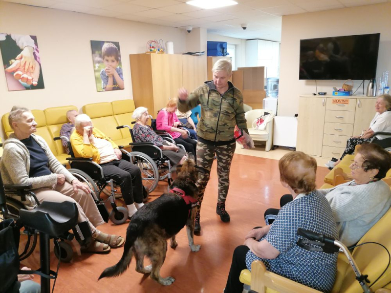 Do nášho zariadenia zavítala pani Olinka so svojou štvornohou asistentkou Bučkou – 10-ročnou fenečkou, ktorú si adoptovala z útulku. Bučka, kríženec nemeckého ovčiaka a zlatého retrívera, očarila svojím krásnym sfarbením, pokojnou a priateľskou