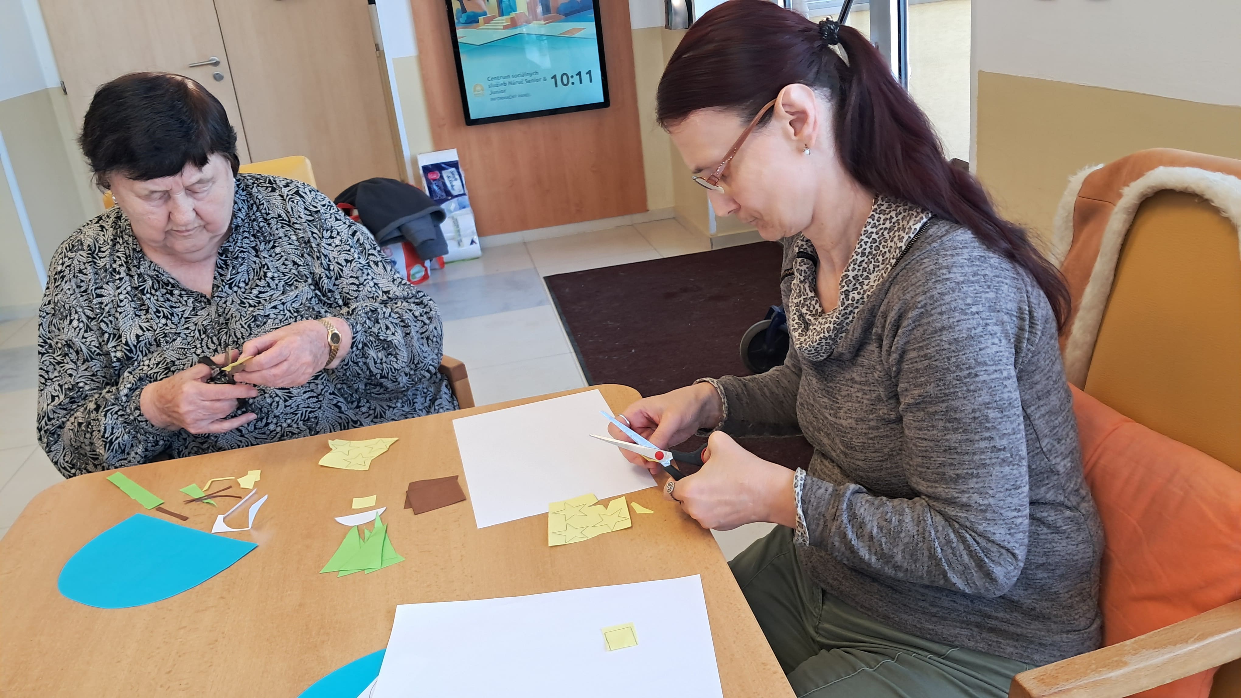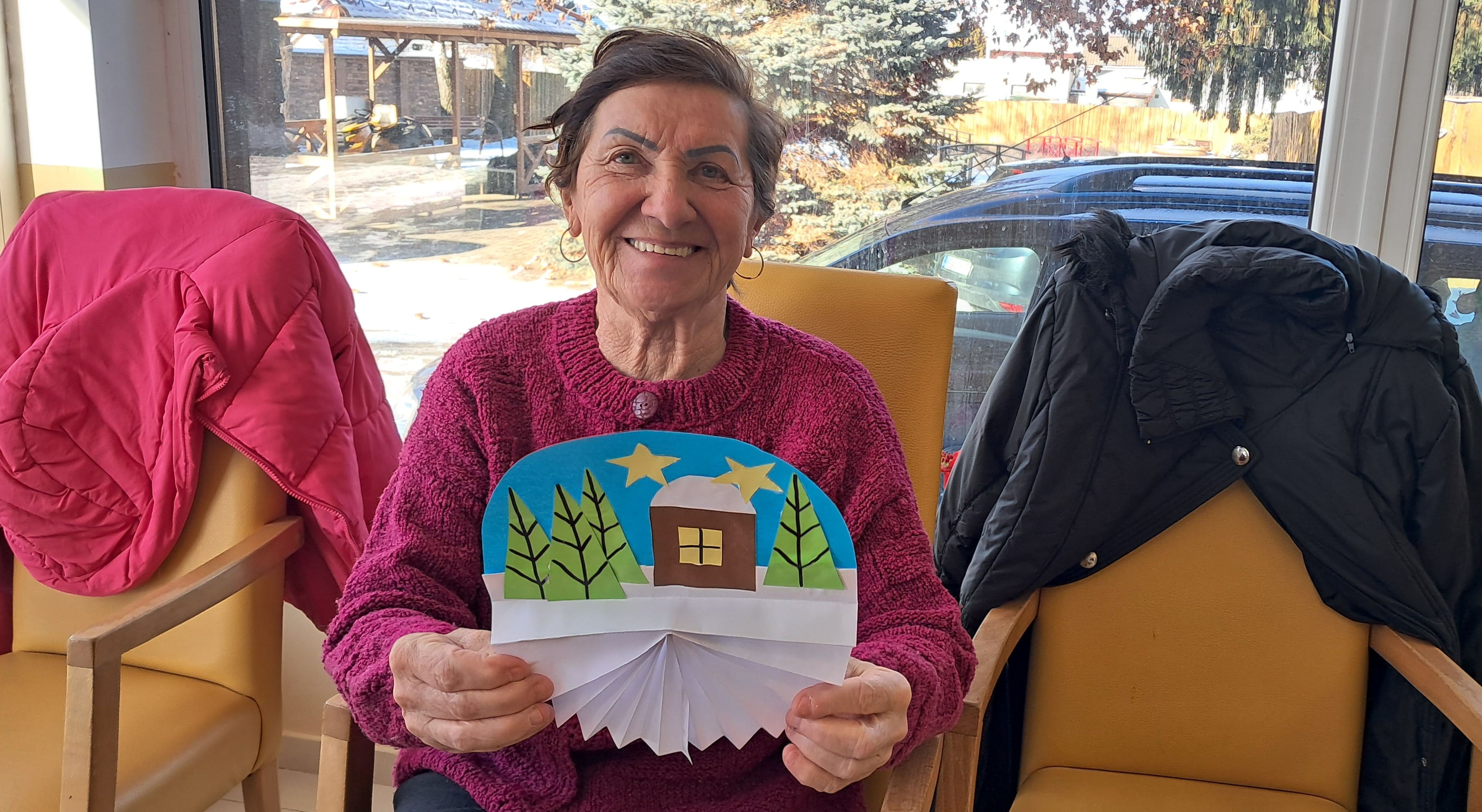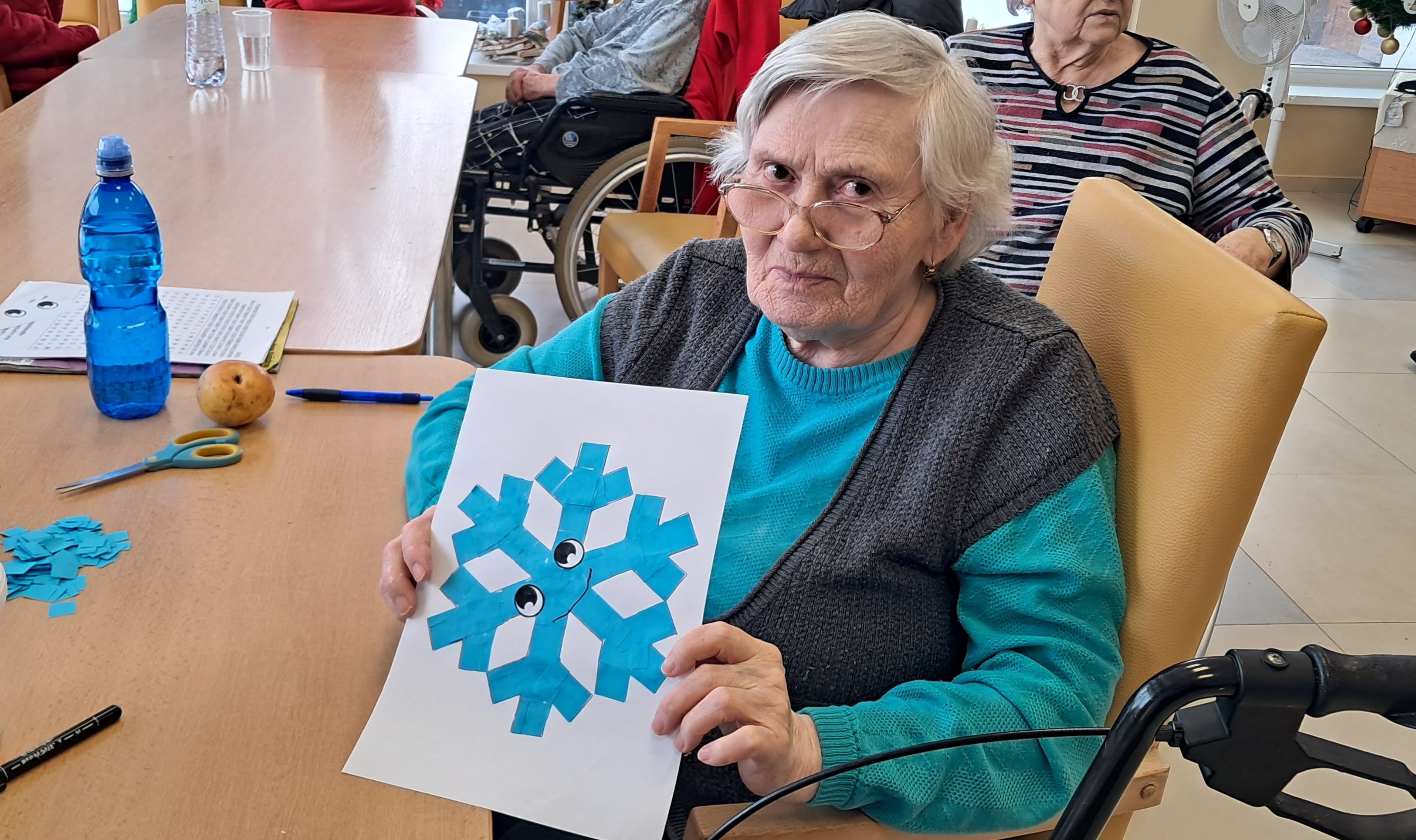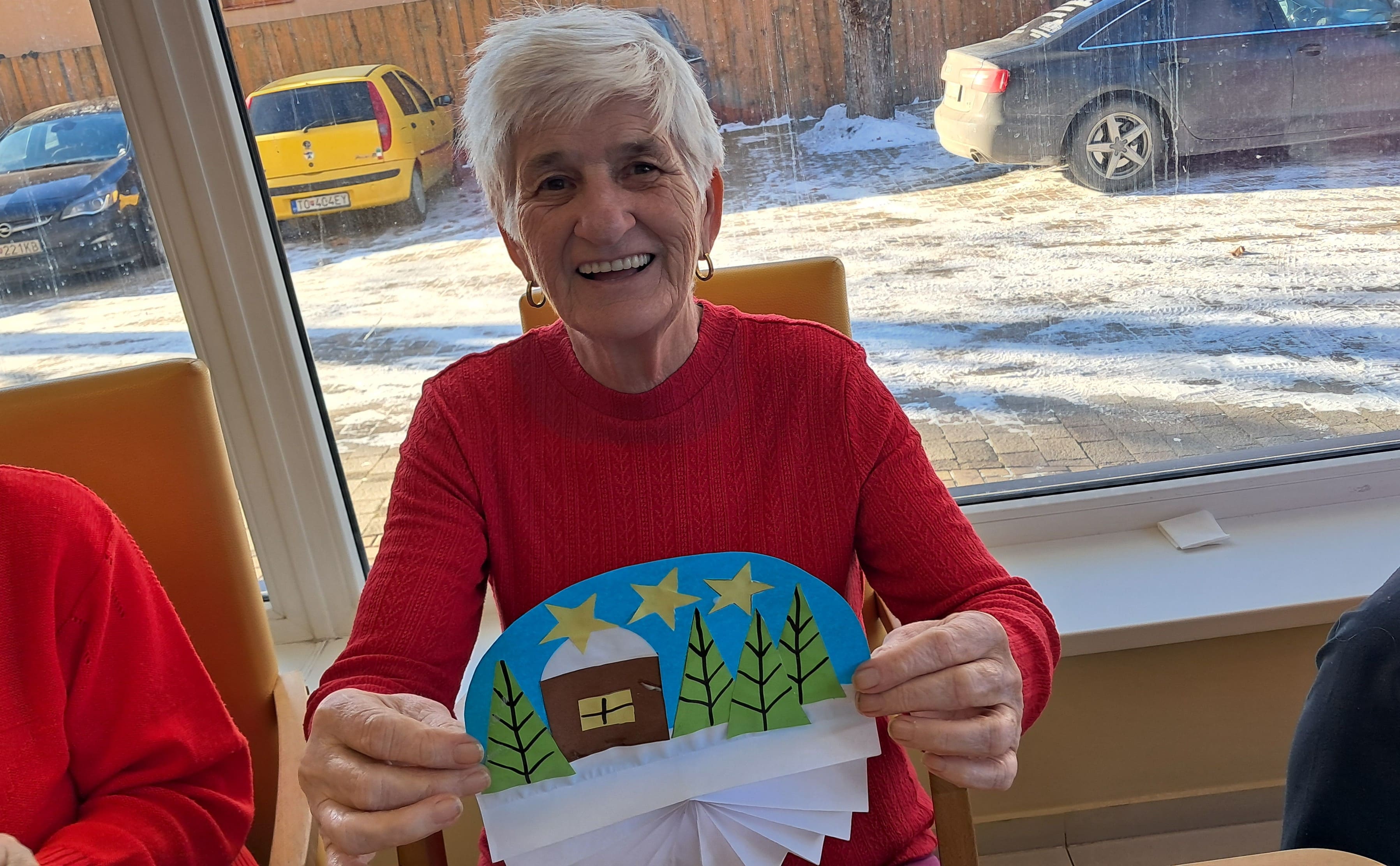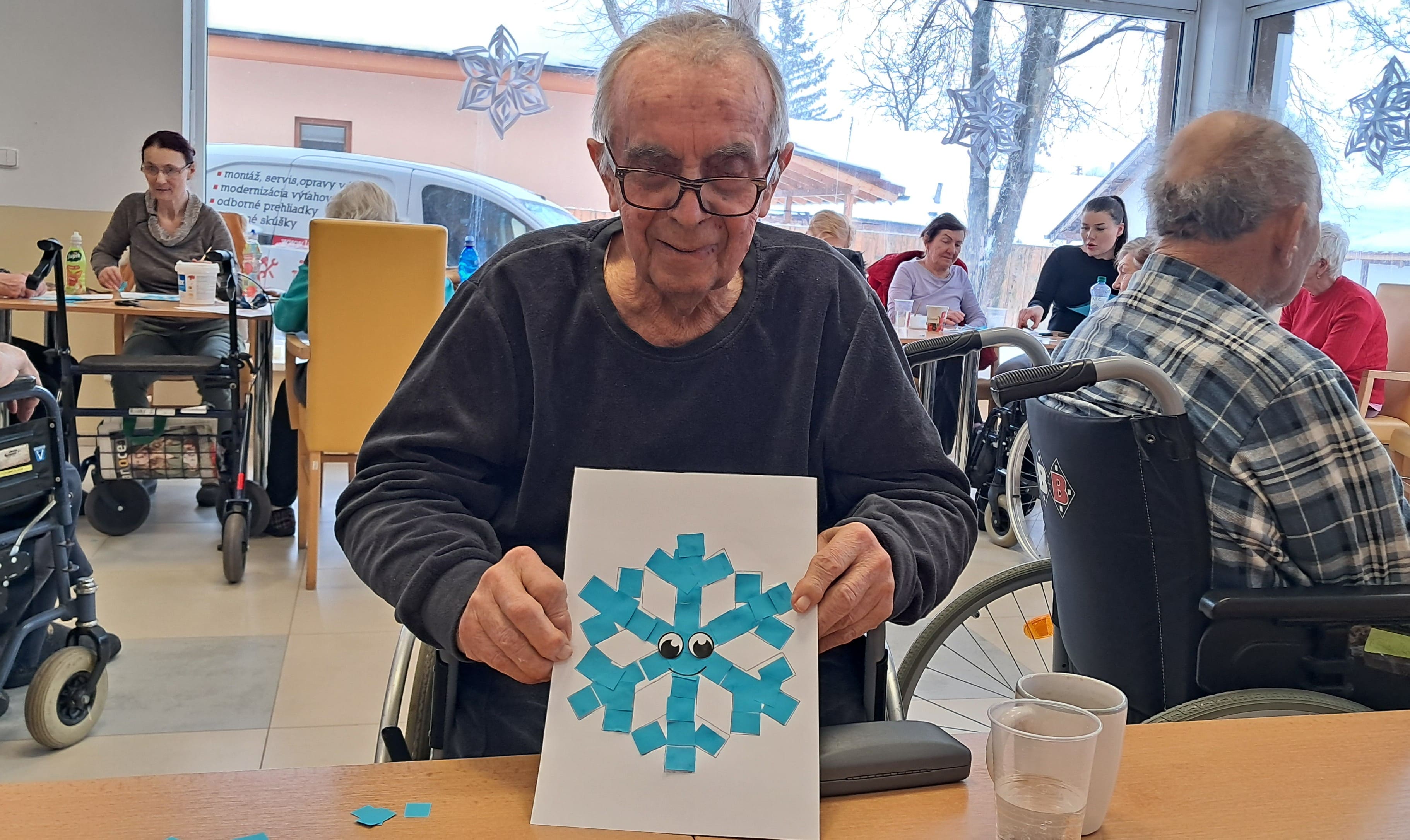 Počas uplynulého týždňa sa naši prijímatelia sociálnych služieb s veľkým nadšením venovali kreatívnemu tvoreniu v zimnom duchu. Z farebného papiera postupne vznikali nádherné zimné krajinky, jemné snehové vločky, zasnežené domčeky dotvorené vatou a veselí snehuliaci. Každý výrobok bol jedinečný a odrážal fantáziu, trpezlivosť a šikovnosť svojich autorov. Tvorivé aktivity priniesli nielen krásne výtvory, ale aj radosť zo spoločnej práce, príjemnú atmosféru a pocit úspechu. Spoločne strávený čas bol naplnený úsmevmi, rozhovormi a zimnou náladou, ktorú sa nám podarilo preniesť aj do našich priestorov.