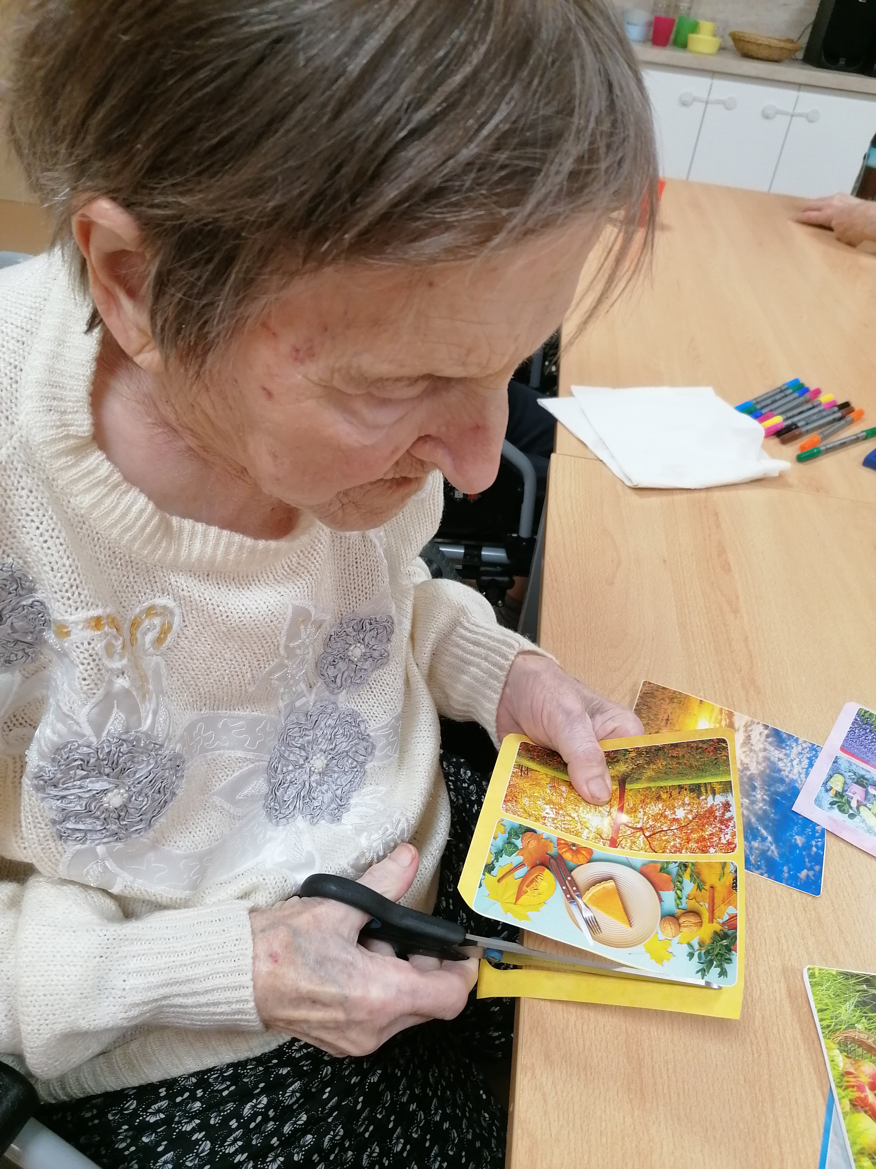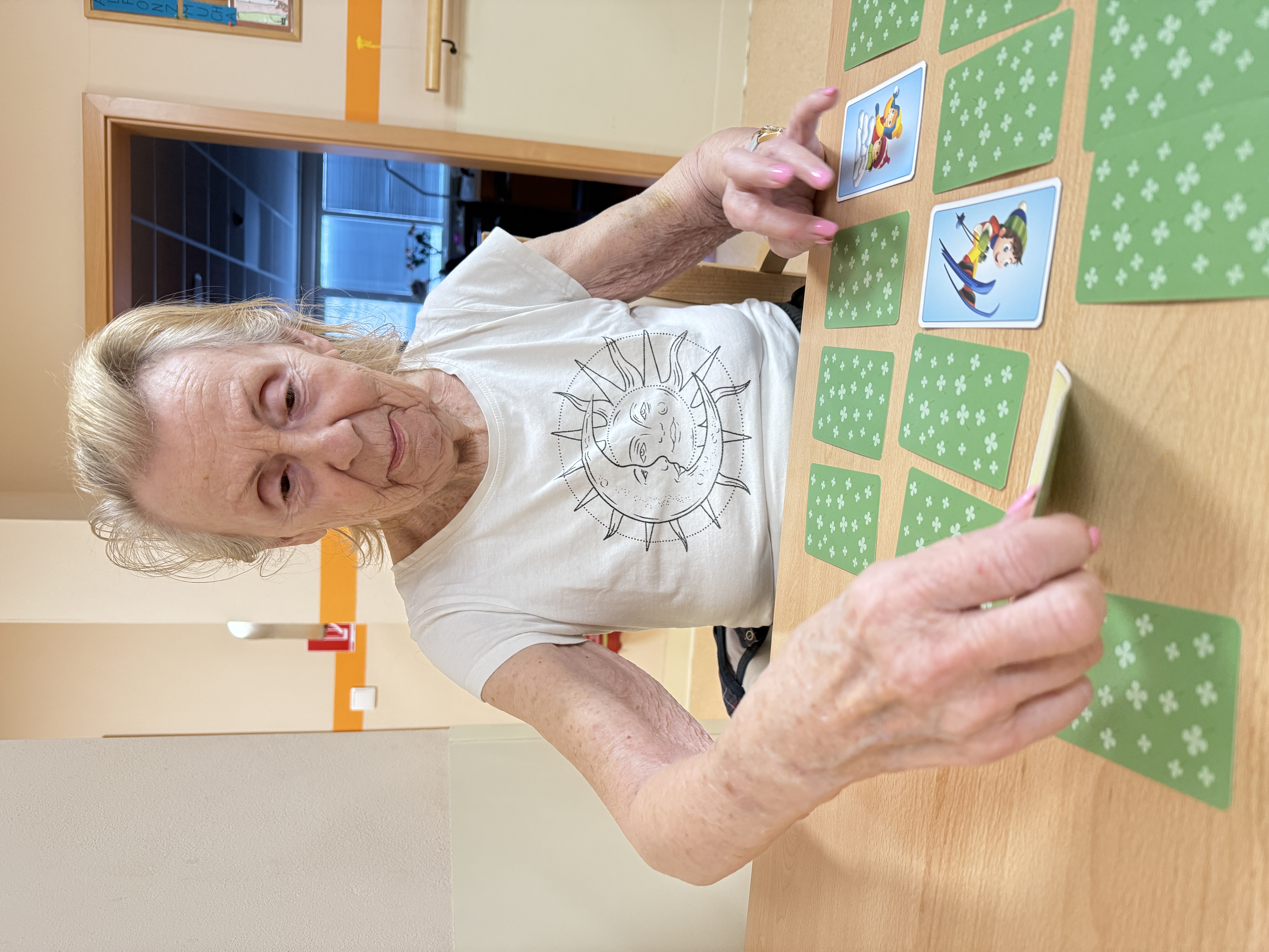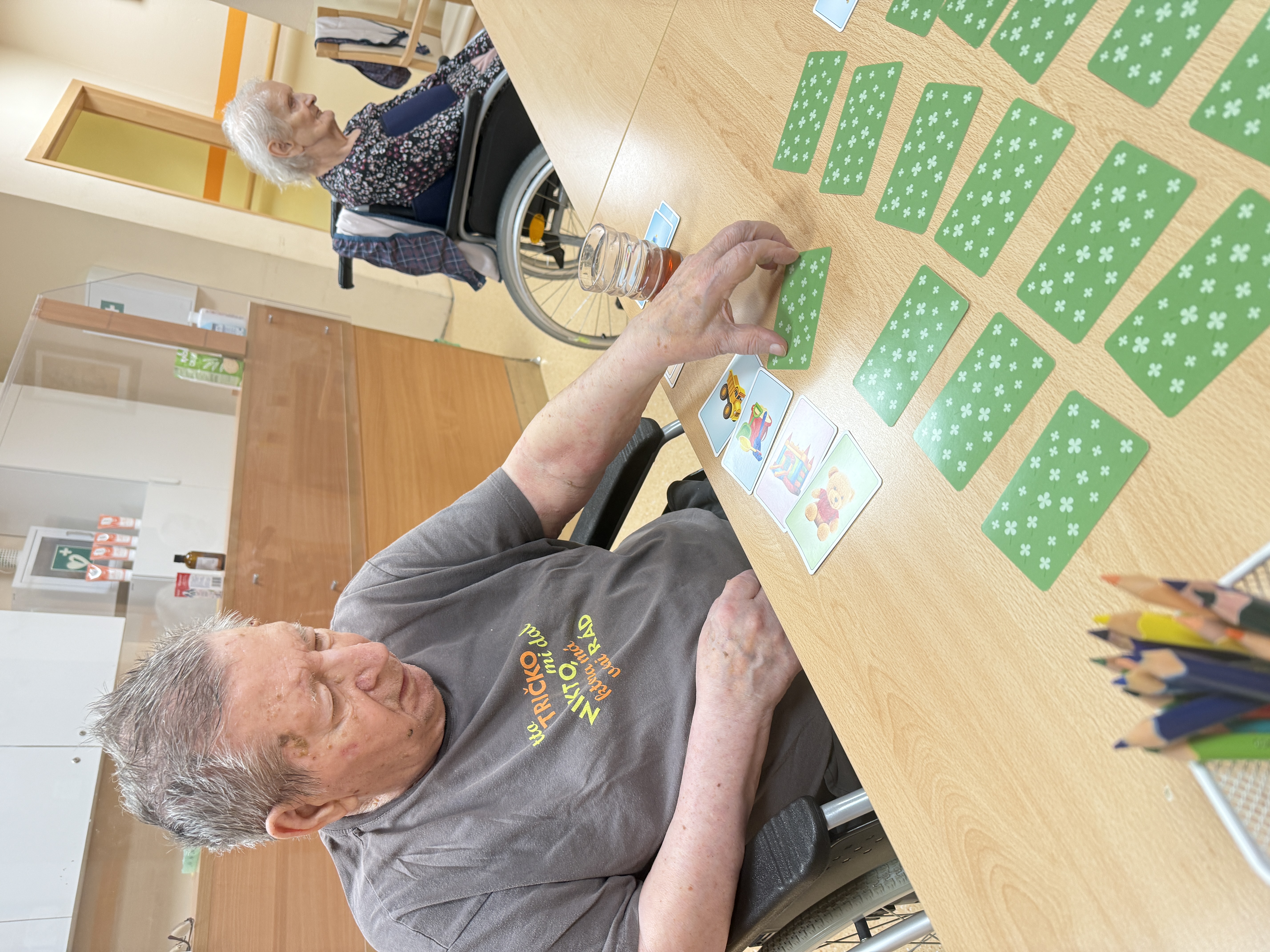 Dni v našom zariadení plynú v pokojnej, priateľskej atmosfére, kde má každý svoje miesto. Tento týždeň sme si spoločný čas spríjemnili spoločenskými hrami : pexeso a bingo nám pomáhajú trénovať pamäť a zároveň prinášajú radosť z hry i malé víťazstvá, ktoré vždy potešia. Venovali sme sa aj jemnému pohybu s loptami. Jednoduché podávanie lopty v kruhu podporilo sústredenie a spoluprácu, zatiaľ čo uvoľňujúca masáž loptičkou príjemne prekrvila ruky a priniesla chvíle relaxu. Pokojné momenty sme vyplnili aj tvorbou koláží, kde mal každý priestor prejaviť svoju kreativitu vlastným tempom. Tieto spoločné stretnutia sú pre nás veľmi vzácne. Byť spolu, rozprávať sa, zdieľať úsmevy a cítiť spolupatričnosť dodáva silu do ďalších dní.