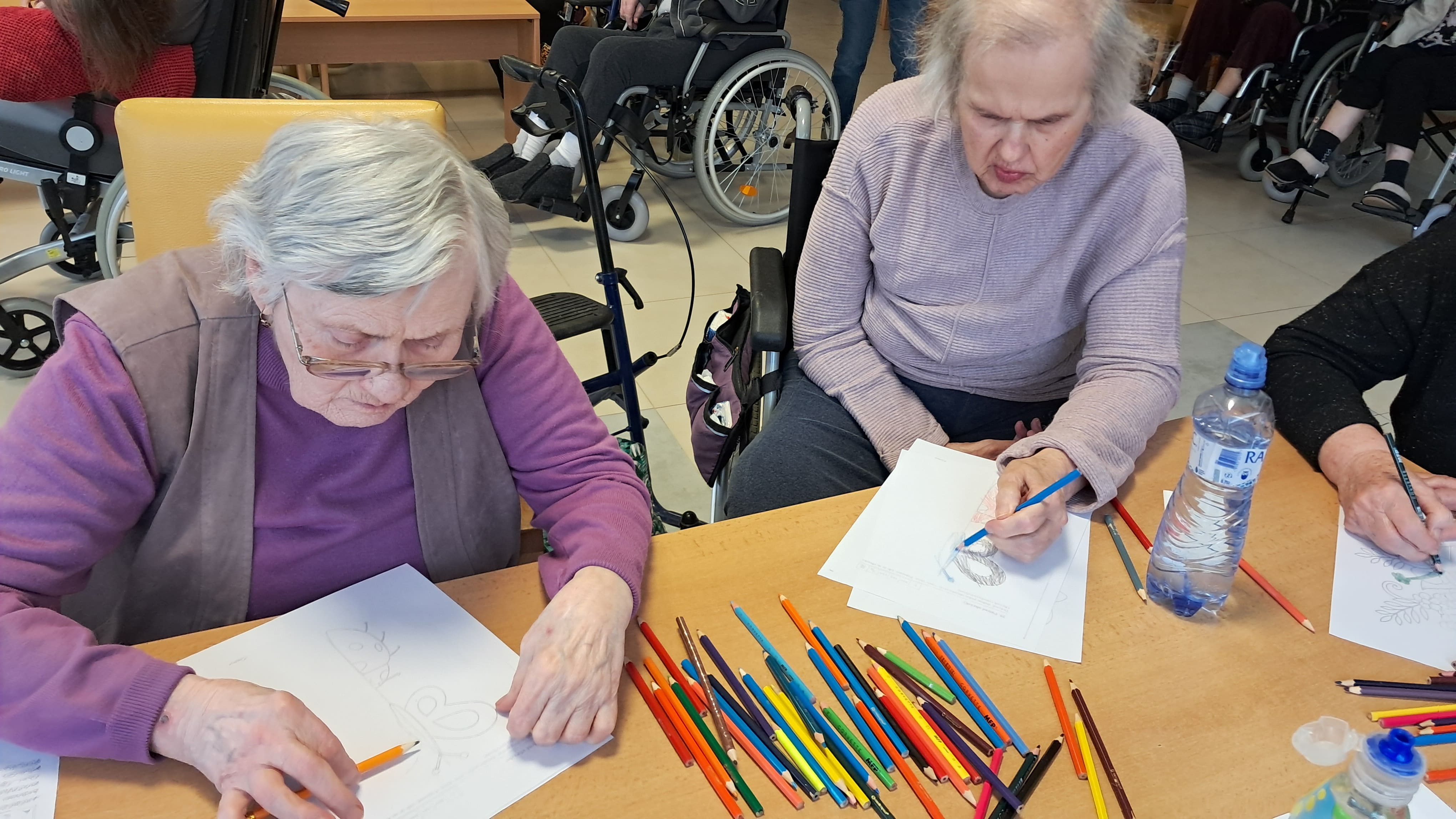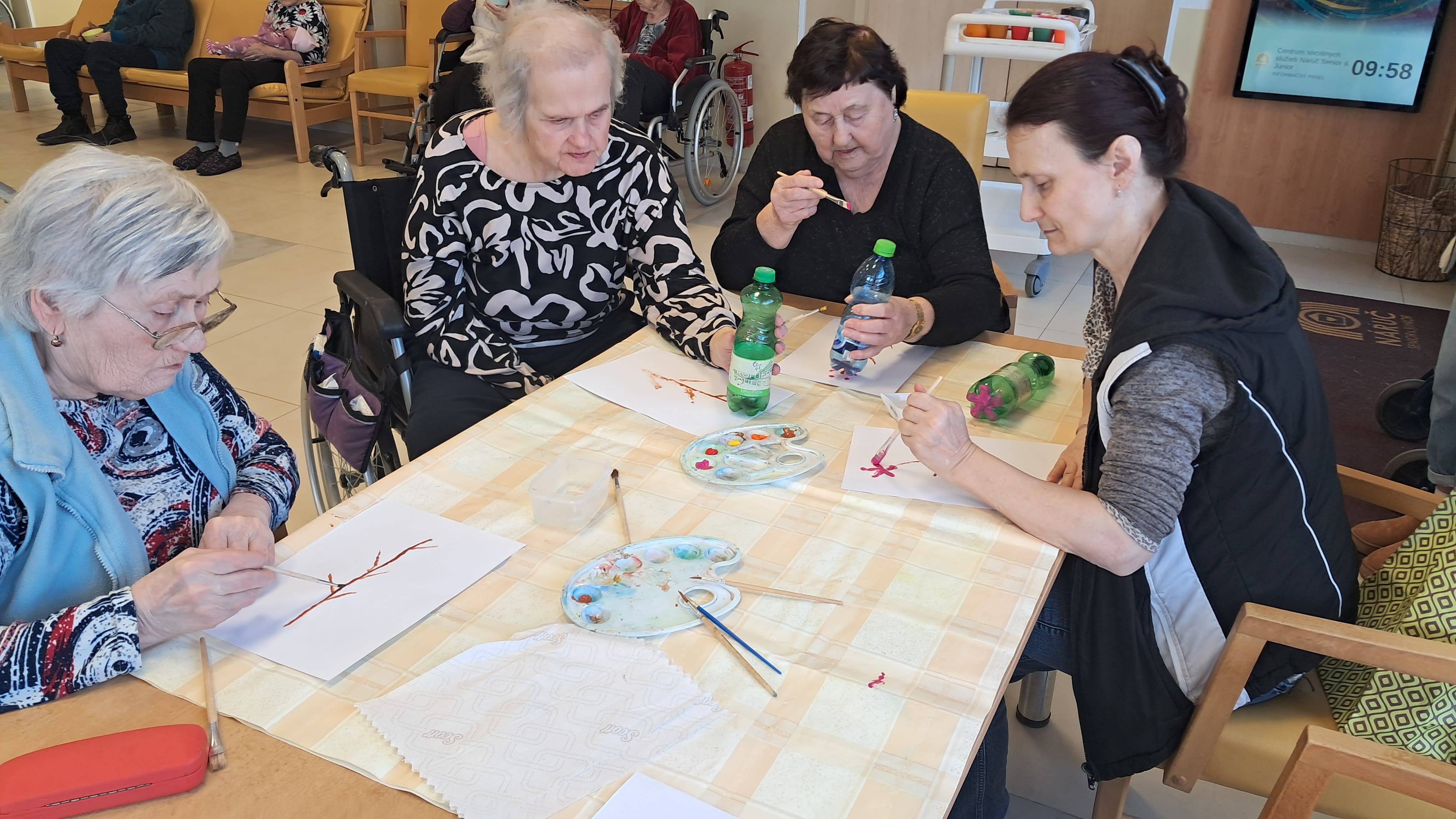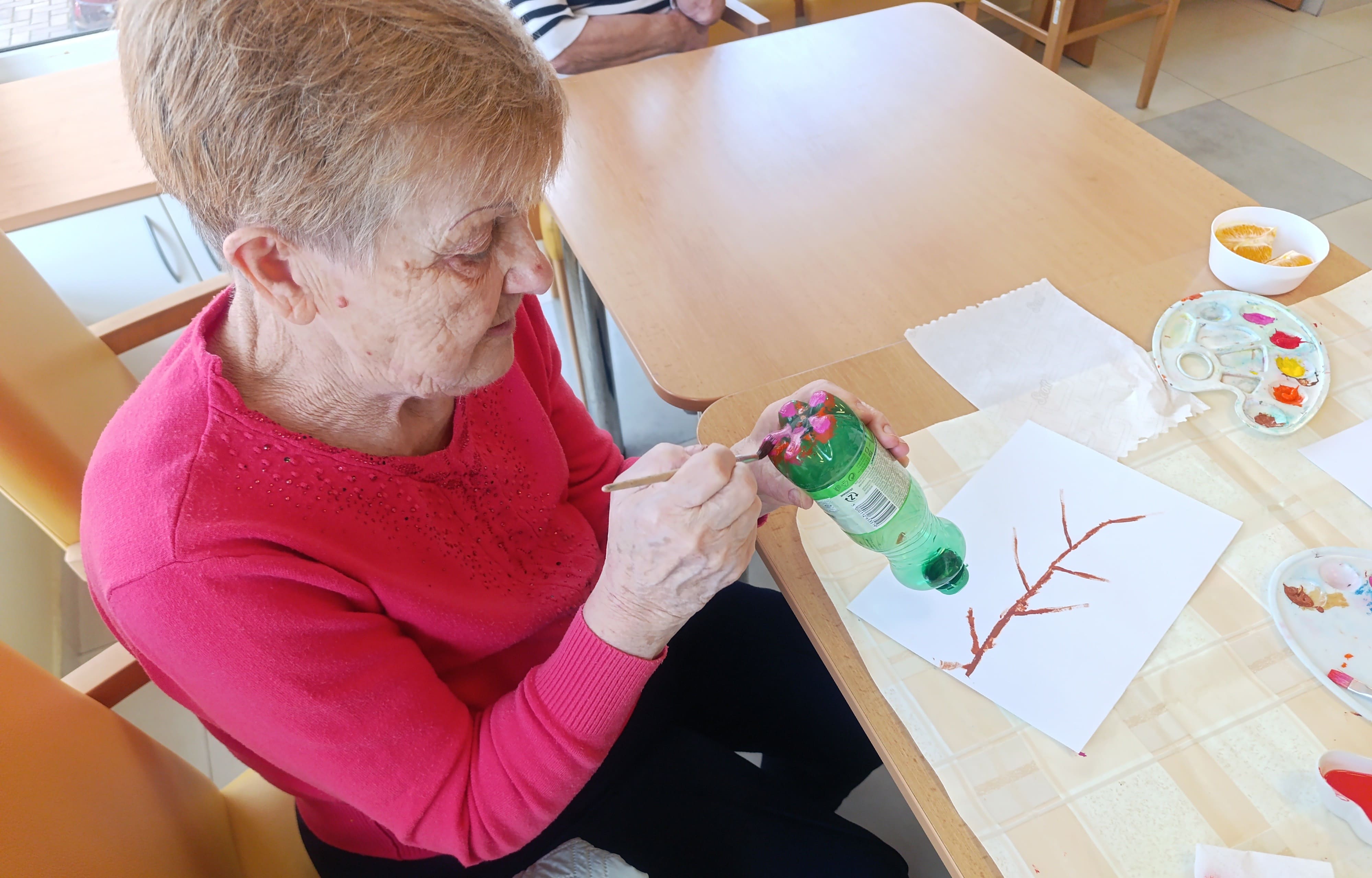 Prijímatelia sociálnych služieb sa zapojili do príjemných jarných tvorivých aktivít, ktoré priniesli radosť aj priestor pre vlastnú fantáziu. Dokresľovali druhú polovicu obrázka podľa predlohy a následne ho vyfarbili podľa svojich predstáv. Pri práci sa snažili zachovať rovnaké tvary a línie, čo si vyžadovalo sústredenie a pozornosť k detailu. Maľovali sme aj drevené jarné ozdoby, pri ktorých si každý mohol vybrať farby a vytvoriť originálne kombinácie. Každý výrobok bol jedinečný a odrážal osobnosť svojho autora. Veľkú radosť priniesla aj technika otláčania plastovej fľaše do farby – na papieri tak vznikli krásne farebné kvety, ktoré sme následne dotvorili maľovaním stoniek a drobných detailov. Tieto aktivity prirodzene podporujú jemnú motoriku, koordináciu oka a ruky, sústredenie aj logické uvažovanie, a zároveň prinášajú pocit spokojnosti z vlastnoručne vytvoreného diela.