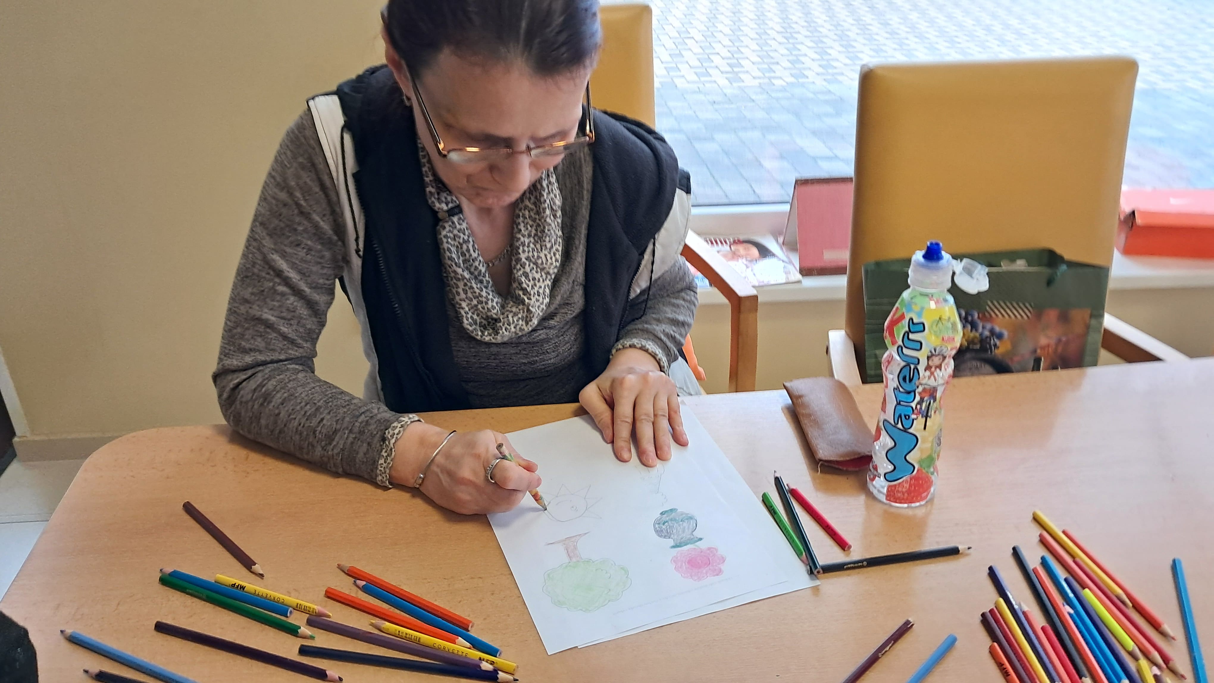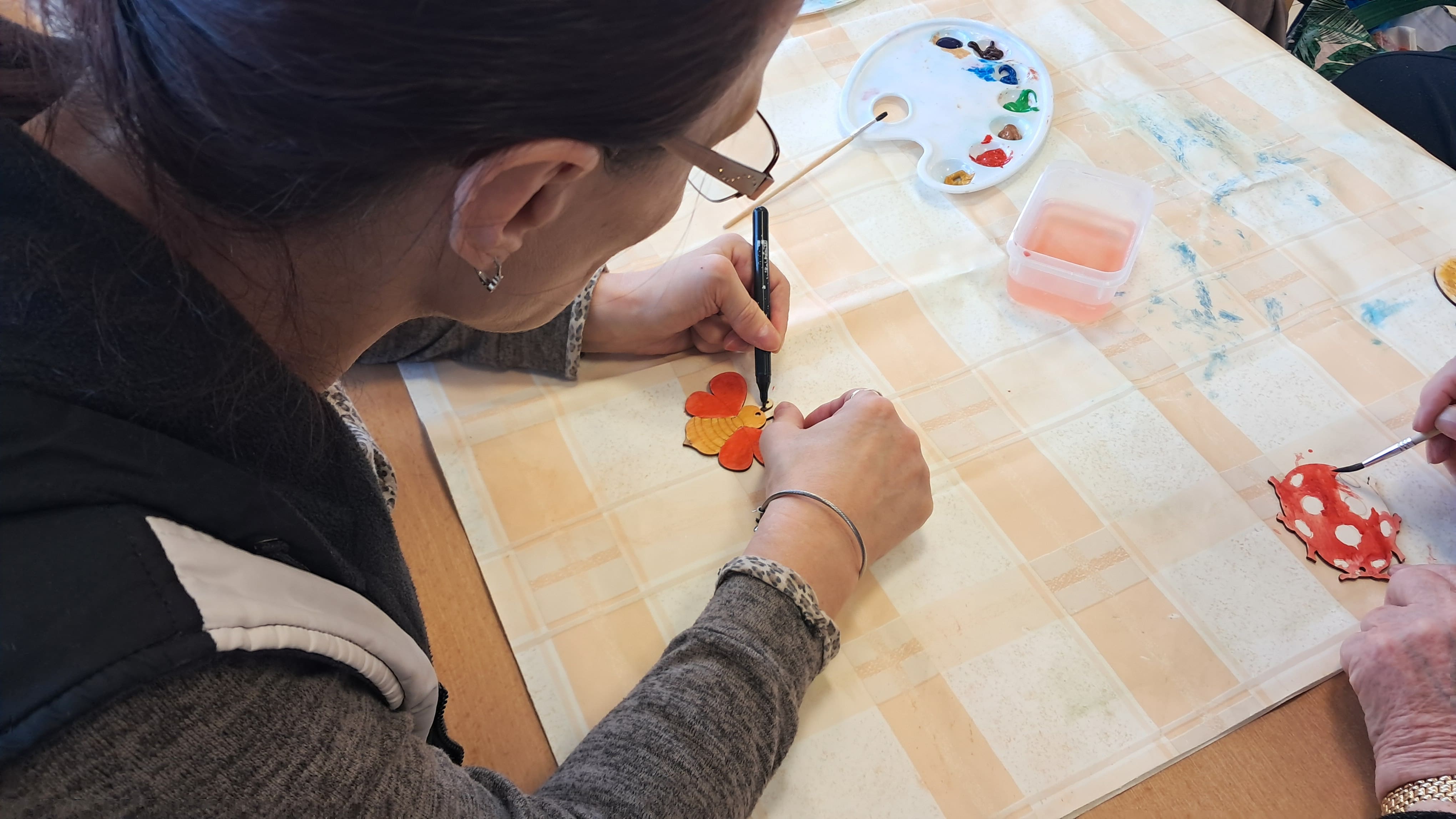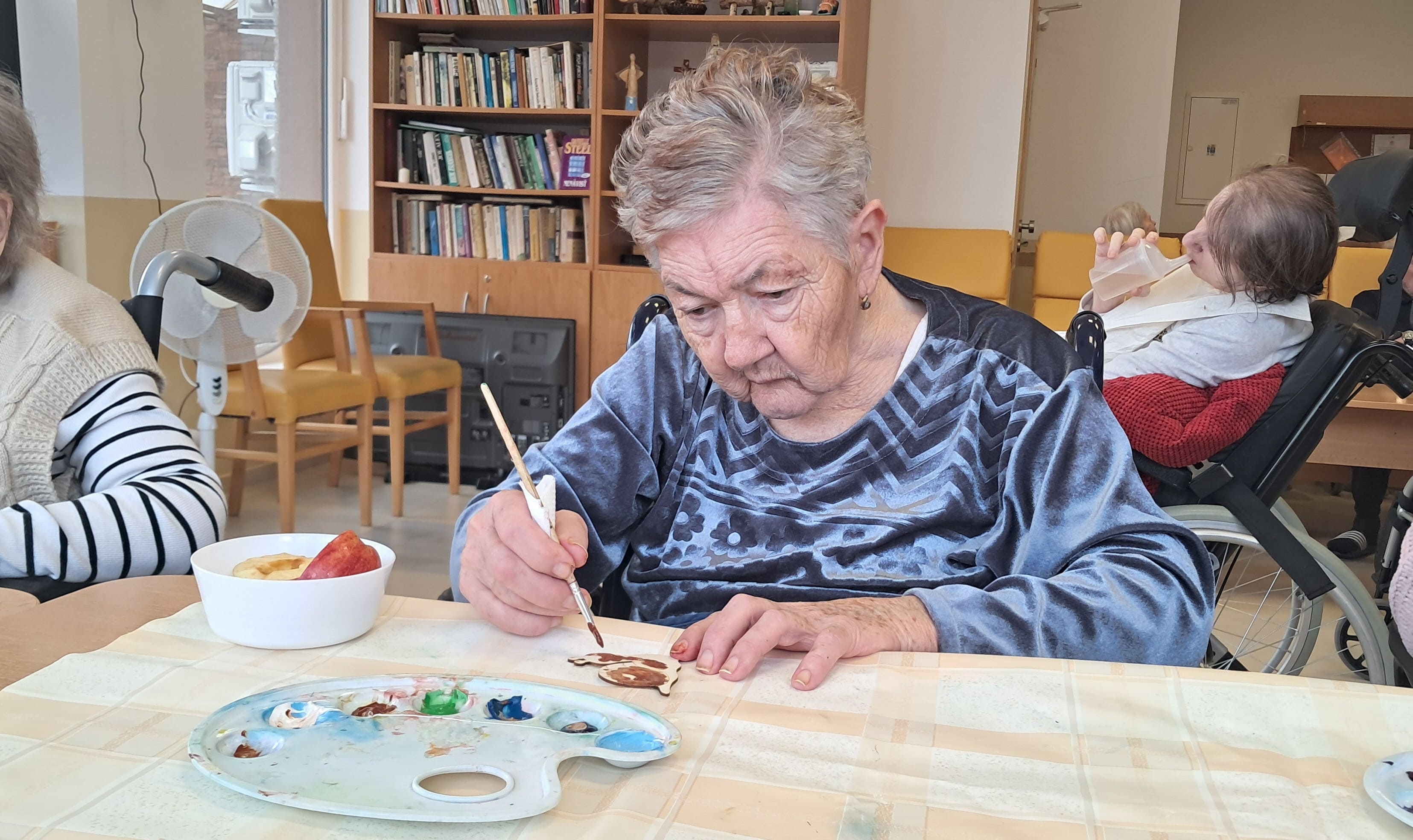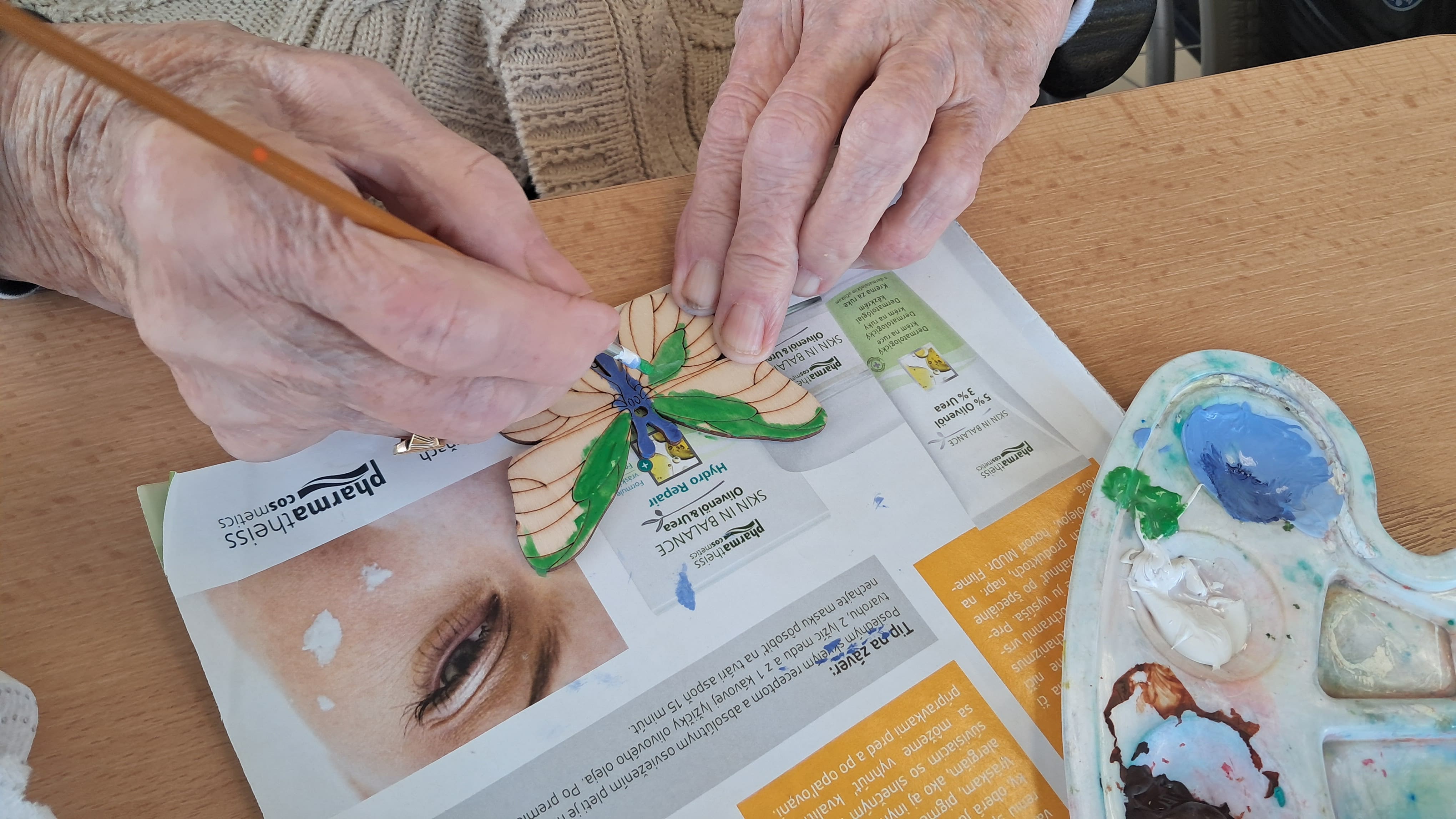 Prijímatelia sociálnych služieb sa zapojili do príjemných jarných tvorivých aktivít, ktoré priniesli radosť aj priestor pre vlastnú fantáziu. Dokresľovali druhú polovicu obrázka podľa predlohy a následne ho vyfarbili podľa svojich predstáv. Pri práci sa snažili zachovať rovnaké tvary a línie, čo si vyžadovalo sústredenie a pozornosť k detailu. Maľovali sme aj drevené jarné ozdoby, pri ktorých si každý mohol vybrať farby a vytvoriť originálne kombinácie. Každý výrobok bol jedinečný a odrážal osobnosť svojho autora. Veľkú radosť priniesla aj technika otláčania plastovej fľaše do farby – na papieri tak vznikli krásne farebné kvety, ktoré sme následne dotvorili maľovaním stoniek a drobných detailov. Tieto aktivity prirodzene podporujú jemnú motoriku, koordináciu oka a ruky, sústredenie aj logické uvažovanie, a zároveň prinášajú pocit spokojnosti z vlastnoručne vytvoreného diela.